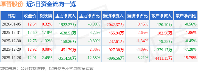 证券之星消息,截至2026年1月5日收盘,厚普股份(300471)报收于12.64元,上涨0.32%,换手率4.64%,成交量17.02万手,成交额2.16亿元。