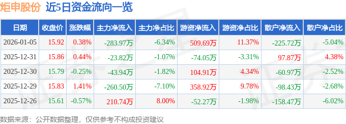 证券之星消息,截至2026年1月5日收盘,炬申股份(001202)报收于15.92元,上涨0.38%,换手率2.41%,成交量2.82万手,成交额4482.52万元。