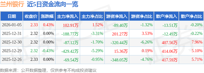 证券之星消息,截至2026年1月5日收盘,兰州银行(001227)报收于2.33元,上涨0.43%,换手率0.69%,成交量29.02万手,成交额6748.77万元。