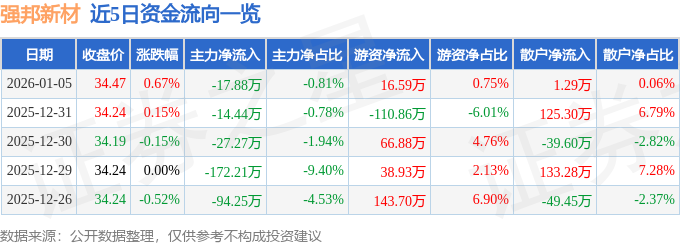 证券之星消息,截至2026年1月5日收盘,强邦新材(001279)报收于34.47元,上涨0.67%,换手率1.6%,成交量6411.0手,成交额2205.46万元。
