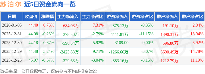 1月5日的资金流向数据方面,主力资金净流入684.03万元,占总成交额7.31%,游资资金净流出875.13万元,占总成交额9.35%,散户资金净流入191.1万元,占总成交额2.04%。
