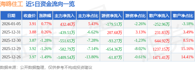 证券之星消息,截至2026年1月5日收盘,海鸥住工(002084)报收于3.91元,上涨0.77%,换手率3.17%,成交量20.43万手,成交额7958.57万元。