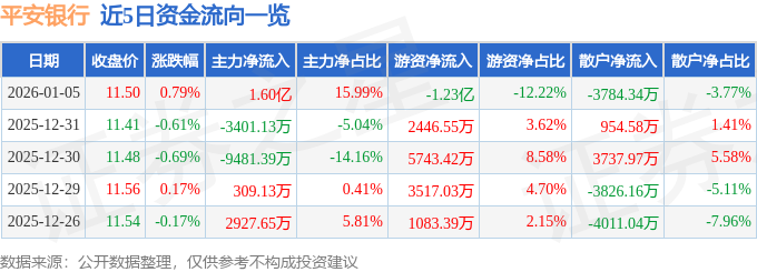 证券之星消息,截至2026年1月5日收盘,平安银行(000001)报收于11.5元,上涨0.79%,换手率0.45%,成交量87.55万手,成交额10.03亿元。