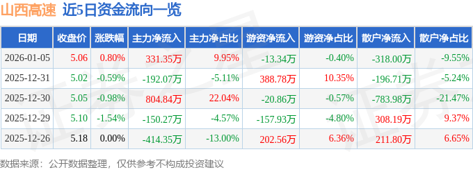 证券之星消息,截至2026年1月5日收盘,山西高速(000755)报收于5.06元,上涨0.8%,换手率0.45%,成交量6.59万手,成交额3329.52万元。