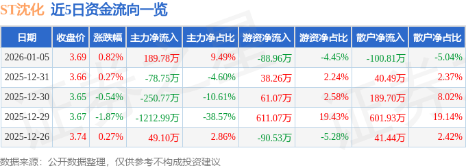 证券之星消息,截至2026年1月5日收盘,ST沈化(000698)报收于3.69元,上涨0.82%,换手率0.69%,成交量5.42万手,成交额1999.8万元。