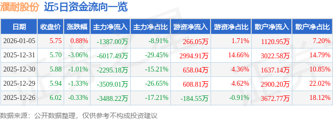 1月5日的资金流向数据方面,主力资金净流出1387.0万元,占总成交额8.91%,游资资金净流入266.05万元,占总成交额1.71%,散户资金净流入1120.95万元,占总成交额7.2%。