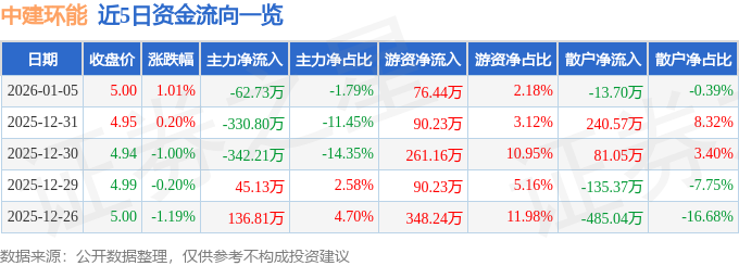 证券之星消息,截至2026年1月5日收盘,中建环能(300425)报收于5.0元,上涨1.01%,换手率1.03%,成交量7.0万手,成交额3510.77万元。