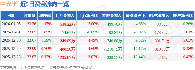 证券之星消息,截至2026年1月5日收盘,中光学(002189)报收于23.36元,上涨1.17%,换手率1.77%,成交量4.63万手,成交额1.08亿元。