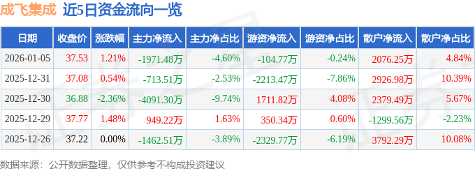 证券之星消息,截至2026年1月5日收盘,成飞集成(002190)报收于37.53元,上涨1.21%,换手率3.2%,成交量11.46万手,成交额4.29亿元。