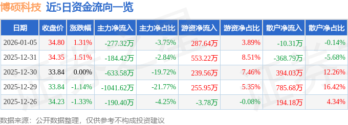 证券之星消息,截至2026年1月5日收盘,博硕科技(300951)报收于34.8元,上涨1.31%,换手率1.41%,成交量2.13万手,成交额7391.32万元。
