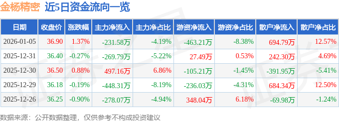 证券之星消息,截至2026年1月5日收盘,金杨精密(301210)报收于36.9元,上涨1.37%,换手率3.45%,成交量1.5万手,成交额5528.28万元。