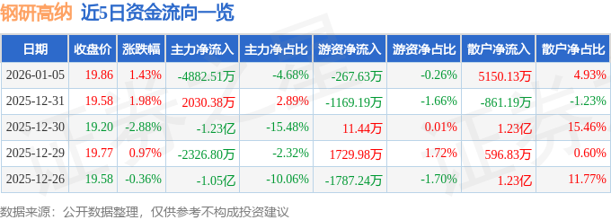 1月5日的资金流向数据方面,主力资金净流出4882.51万元,占总成交额4.68%,游资资金净流出267.63万元,占总成交额0.26%,散户资金净流入5150.13万元,占总成交额4.93%。
