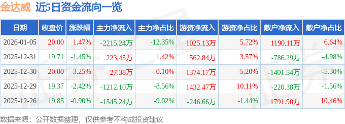 1月5日的资金流向数据方面,主力资金净流出2215.24万元,占总成交额12.35%,游资资金净流入1025.13万元,占总成交额5.72%,散户资金净流入1190.11万元,占总成交额6.64%。
