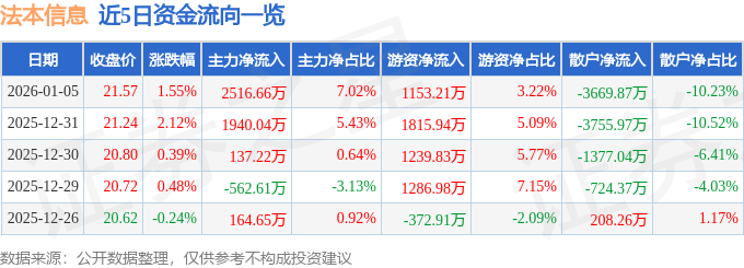 证券之星消息,截至2026年1月5日收盘,法本信息(300925)报收于21.57元,上涨1.55%,换手率4.79%,成交量16.73万手,成交额3.59亿元。
