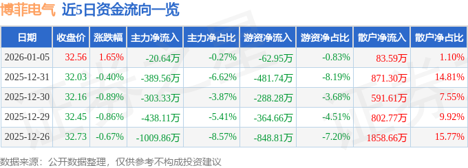证券之星消息,截至2026年1月5日收盘,博菲电气(001255)报收于32.56元,上涨1.65%,换手率3.29%,成交量2.34万手,成交额7566.58万元。