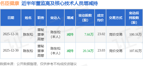 名臣健康近半年内的董监高及核心技术人员增减持详情如下: