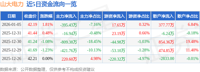 证券之星消息,截至2026年1月5日收盘,山大电力(301609)报收于42.19元,上涨1.81%,换手率3.79%,成交量1.32万手,成交额5521.35万元。
