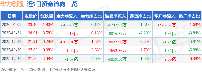 证券之星消息,截至2026年1月5日收盘,华力创通(300045)报收于29.46元,上涨1.9%,换手率27.14%,成交量140.15万手,成交额41.27亿元。