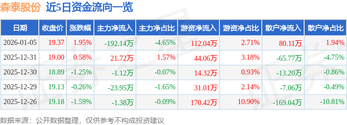 证券之星消息,截至2026年1月5日收盘,森泰股份(301429)报收于19.37元,上涨1.95%,换手率4.82%,成交量2.12万手,成交额4128.97万元。