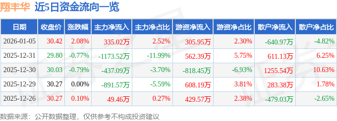 证券之星消息,截至2026年1月5日收盘,翔丰华(300890)报收于30.42元,上涨2.08%,换手率4.04%,成交量4.4万手,成交额1.33亿元。
