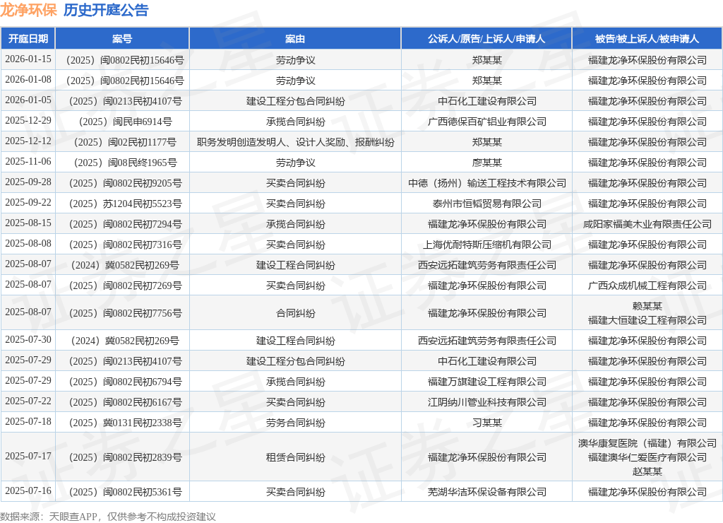 案号:(2025)闽0802民初15646号根据统计,近一年内以福建龙净环保股份有限公司为当事人的历史开庭公告有71则,其中案由为“买卖合同纠纷”的公告以14则居首,其次为“承揽合同纠纷”有12则,“建设工程施工合同纠纷”有10则。历史开庭公告(前20条)如下: