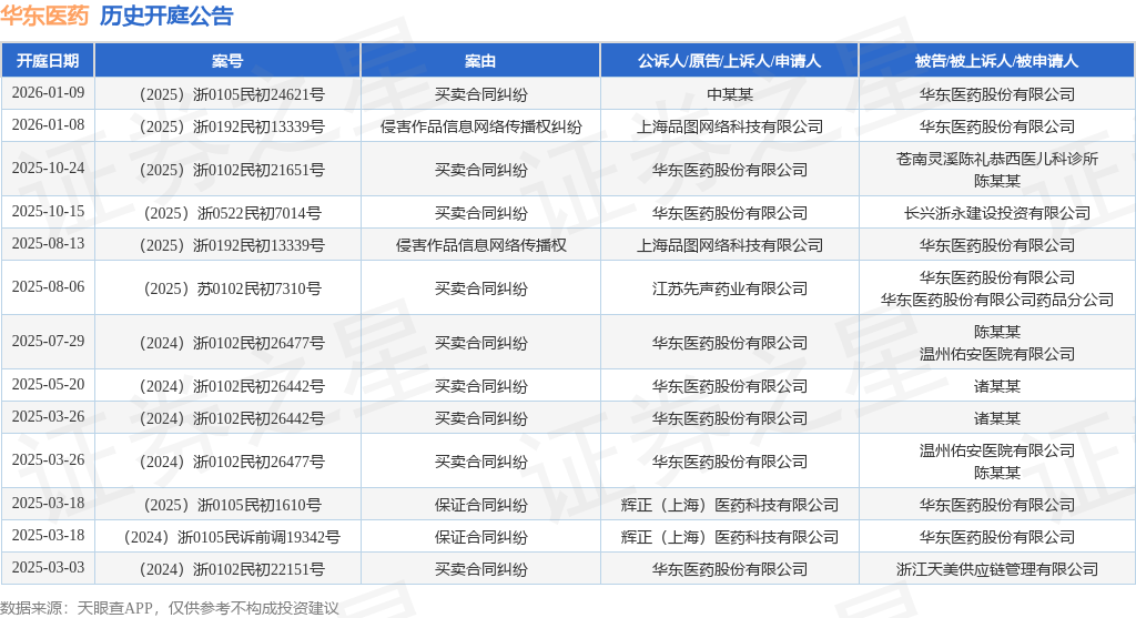 案号:(2025)浙0192民初13339号根据统计,近一年内以华东医药股份有限公司为当事人的历史开庭公告有13则,其中案由为“买卖合同纠纷”的公告以9则居首,其次为“保证合同纠纷”有2则,“侵害作品信息网络传播权”有1则。历史开庭公告如下: