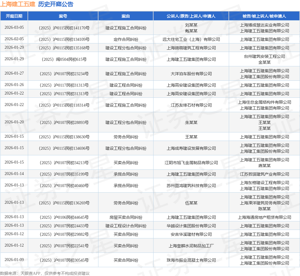 证券之星消息,根据天眼查APP显示,近日公布了一则上海建工五建集团有限公司作为原告/上诉人的开庭公告,详细内容如下: