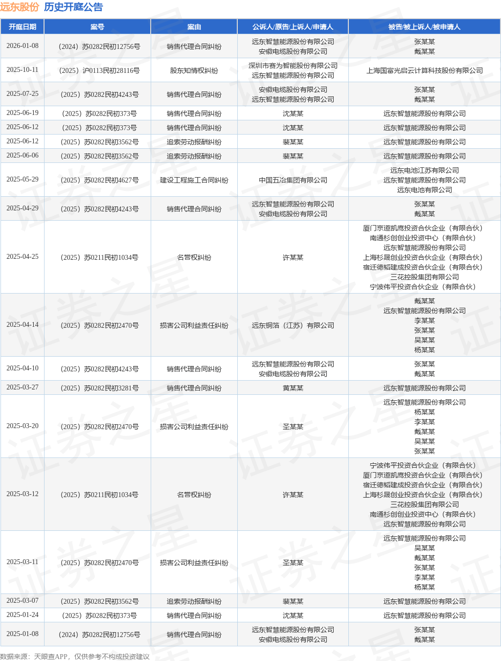 案号:(2024)苏0282民初12756号根据统计,近一年内以远东智慧能源股份有限公司为当事人的历史开庭公告有19则,其中案由为“销售代理合同纠纷”的公告以9则居首,其次为“损害公司利益责任纠纷”有3则,“追索劳动报酬纠纷”有3则。历史开庭公告如下: