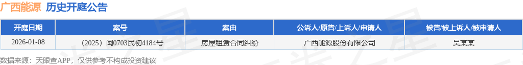 根据统计,近一年内以广西能源股份有限公司为当事人的历史开庭公告有1则,其中案由为“房屋租赁合同纠纷”的公告以1则居首。历史开庭公告如下: