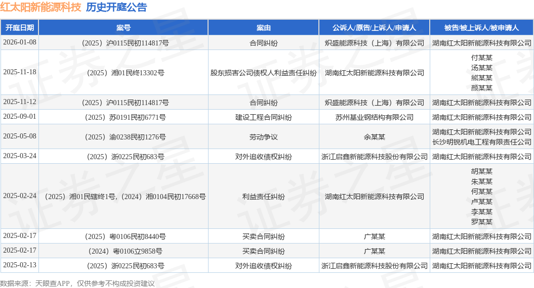 案号:(2025)沪0115民初114817号根据统计,近一年内以湖南红太阳新能源科技有限公司为当事人的历史开庭公告有10则,其中案由为“买卖合同纠纷”的公告以2则居首,其次为“合同纠纷”有2则,“对外追收债权纠纷”有2则。历史开庭公告如下: