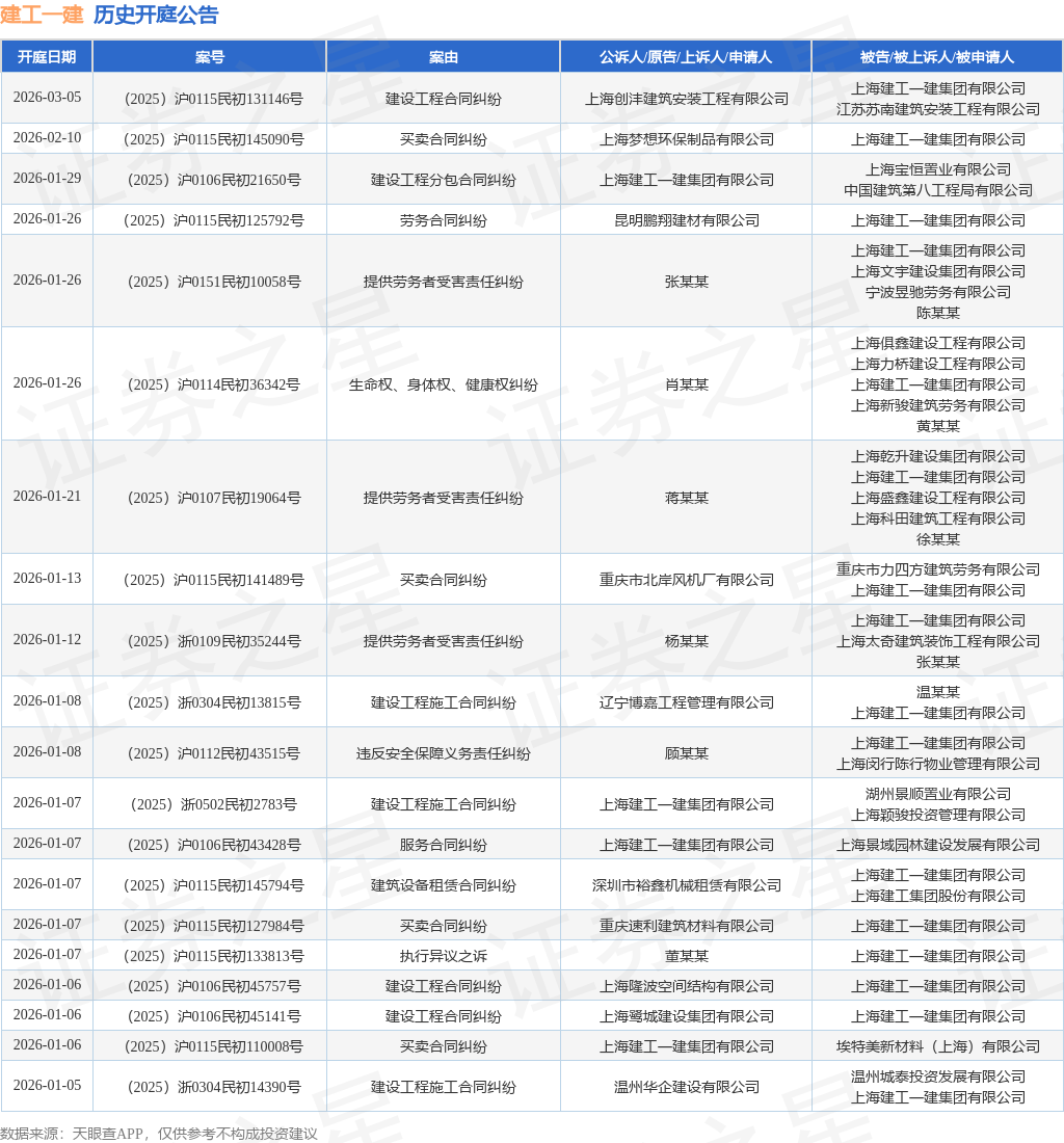 案号:(2025)沪0112民初43515号根据统计,近一年内以上海建工一建集团有限公司为当事人的历史开庭公告有286则,其中案由为“买卖合同纠纷”的公告以78则居首,其次为“建设工程施工合同纠纷”有38则,“建设工程分包合同纠纷”有33则。历史开庭公告(前20条)如下: