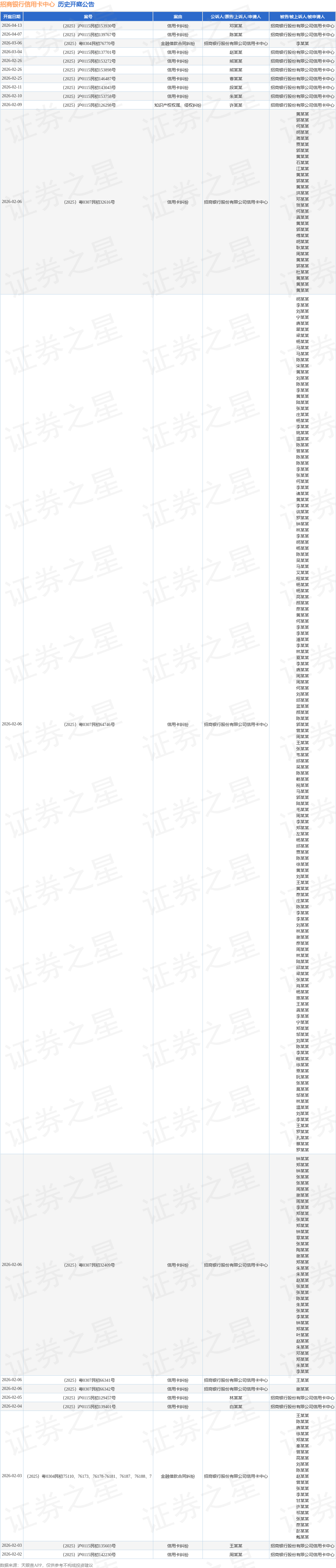 案号:(2025)沪0115民初103615号根据统计,近一年内以招商银行股份有限公司信用卡中心为当事人的历史开庭公告有11343则,其中案由为“信用卡纠纷”的公告以9374则居首,其次为“金融借款合同纠纷”有1850则,“小额借款合同纠纷”有30则。历史开庭公告(前20条)如下: