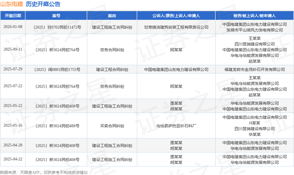 案号:(2025)甘0702民初11472号根据统计,近一年内以中国电建集团山东电力建设有限公司为当事人的历史开庭公告有8则,其中案由为“建设工程施工合同纠纷”的公告以4则居首,其次为“劳务合同纠纷”有2则,“买卖合同纠纷”有1则。历史开庭公告如下: