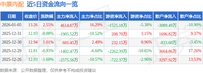 证券之星消息,截至2026年1月5日收盘,中原内配(002448)报收于13.26元,上涨2.55%,换手率4.74%,成交量21.6万手,成交额2.83亿元。