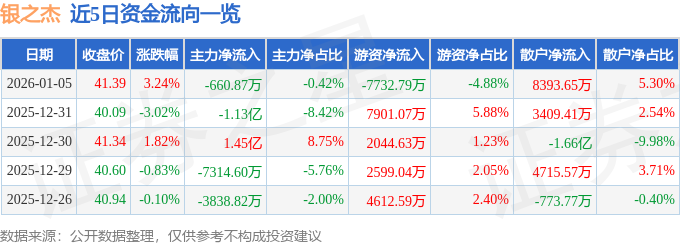 1月5日的资金流向数据方面,主力资金净流出660.87万元,占总成交额0.42%,游资资金净流出7732.79万元,占总成交额4.88%,散户资金净流入8393.65万元,占总成交额5.3%。