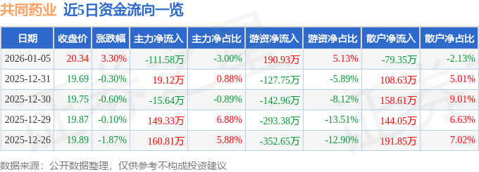 证券之星消息,截至2026年1月5日收盘,共同药业(300966)报收于20.34元,上涨3.3%,换手率2.41%,成交量1.84万手,成交额3719.13万元。