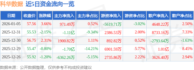 证券之星消息,截至2026年1月5日收盘,科华数据(002335)报收于57.56元,上涨3.66%,换手率7.17%,成交量32.59万手,成交额18.59亿元。