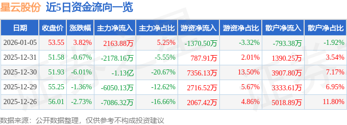 证券之星消息,截至2026年1月5日收盘,星云股份(300648)报收于53.55元,上涨3.82%,换手率5.87%,成交量7.79万手,成交额4.12亿元。