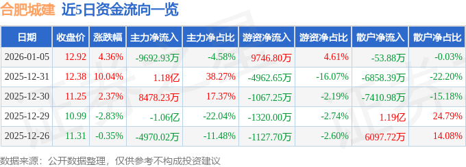 证券之星消息,截至2026年1月5日收盘,合肥城建(002208)报收于12.92元,上涨4.36%,换手率21.35%,成交量171.48万手,成交额21.15亿元。