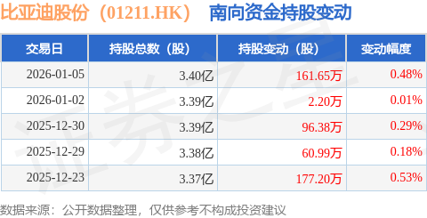 证券之星消息,1月5日南向资金增持161.65万股比亚迪股份(01211.HK)。近5个交易日中,获南向资金增持的有5天,累计净增持498.42万股。近20个交易日中,获南向资金增持的有20天,累计净增持2922.69万股。截至目前,南向资金持有比亚迪股份(01211.HK)3.4亿股,占公司已发行普通股的9.23%。