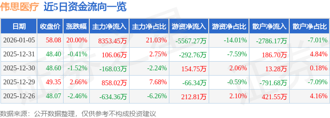 证券之星消息,截至2026年1月5日收盘,伟思医疗(688580)报收于58.08元,上涨20.0%,涨停,换手率7.33%,成交量7.02万手,成交额3.97亿元。