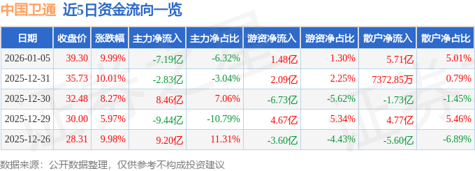 证券之星消息,截至2026年1月5日收盘,中国卫通(601698)报收于39.3元,上涨9.99%,已连续涨停2天,换手率7.03%,成交量297.11万手,成交额113.89亿元。