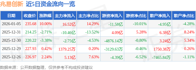 1月5日的资金流向数据方面,主力资金净流入16.52亿元,占总成交额14.29%,游资资金净流出11.58亿元,占总成交额10.01%,散户资金净流出4.95亿元,占总成交额4.28%。