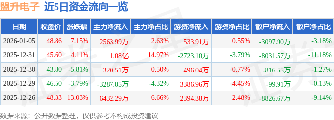 证券之星消息,截至2026年1月5日收盘,盟升电子(688311)报收于48.86元,上涨7.15%,换手率11.91%,成交量20.0万手,成交额9.75亿元。