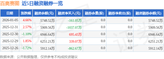 百奥赛图融资融券信息显示,融资方面,当日融资买入3423.52万元,融资偿还3584.56万元,融资净偿还161.05万元。融券方面,融券卖出0.0股,融券偿还0.0股,融券余量0.0股,融券余额0.0万元。融资融券余额5748.52万元。