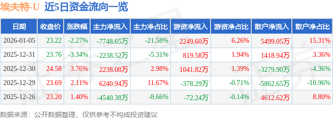 1月5日的资金流向数据方面,主力资金净流出7748.65万元,占总成交额21.58%,游资资金净流入2249.6万元,占总成交额6.26%,散户资金净流入5499.05万元,占总成交额15.31%。