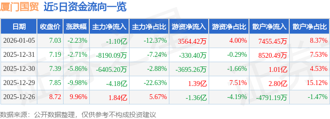 证券之星消息,截至2026年1月5日收盘,厦门国贸(600755)报收于7.03元,下跌2.23%,换手率5.91%,成交量126.05万手,成交额8.91亿元。