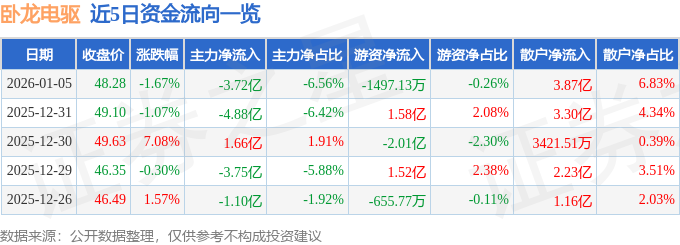 证券之星消息,截至2026年1月5日收盘,卧龙电驱(600580)报收于48.28元,下跌1.67%,换手率7.53%,成交量117.24万手,成交额56.75亿元。