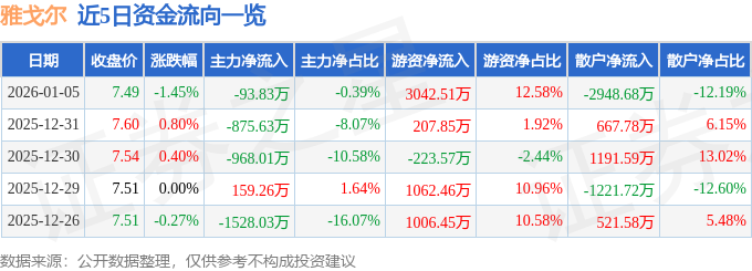 证券之星消息,截至2026年1月5日收盘,雅戈尔(600177)报收于7.49元,下跌1.45%,换手率0.7%,成交量32.33万手,成交额2.42亿元。