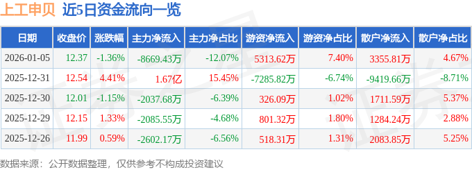 1月5日的资金流向数据方面,主力资金净流出8669.43万元,占总成交额12.07%,游资资金净流入5313.62万元,占总成交额7.4%,散户资金净流入3355.81万元,占总成交额4.67%。